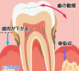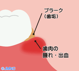 歯周病の原因は、歯に付着したプラーク(歯垢)に含まれるバクテリア(歯周病菌)が歯周組織を次々に破壊し骨まで溶かしてしまう病気です。